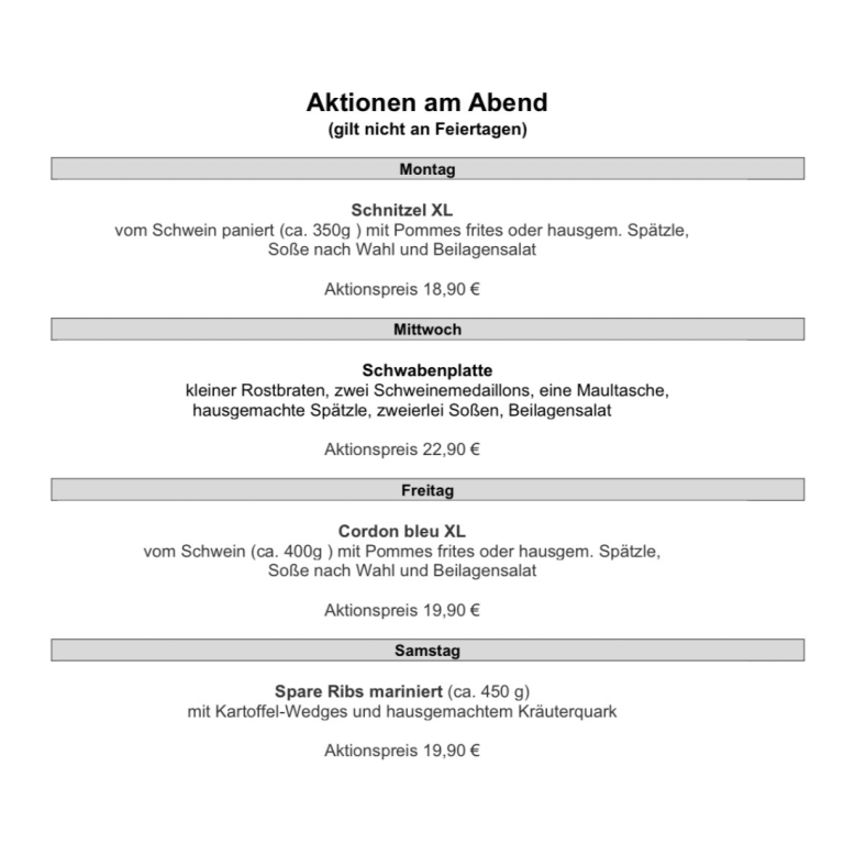 Tauchen Sie ein in die Welt der traditionellen Küche und genießen Sie die herzliche Gastfreundschaft. Bei uns werden Sie mit regionalen Spezialitäten verwöhnt, die mit viel Liebe und frischen Zutaten zubereitet werden. Ob saftiger Rostbraten, zartes Schnitzel oder hausgemachte Maultaschen – jeder Bissen ist ein Geschmackserlebnis. Begleiten Sie Ihr Essen mit einem kühlen Bier oder mit unseren leckeren Weinen aus der Region und lassen Sie den Alltag hinter sich."